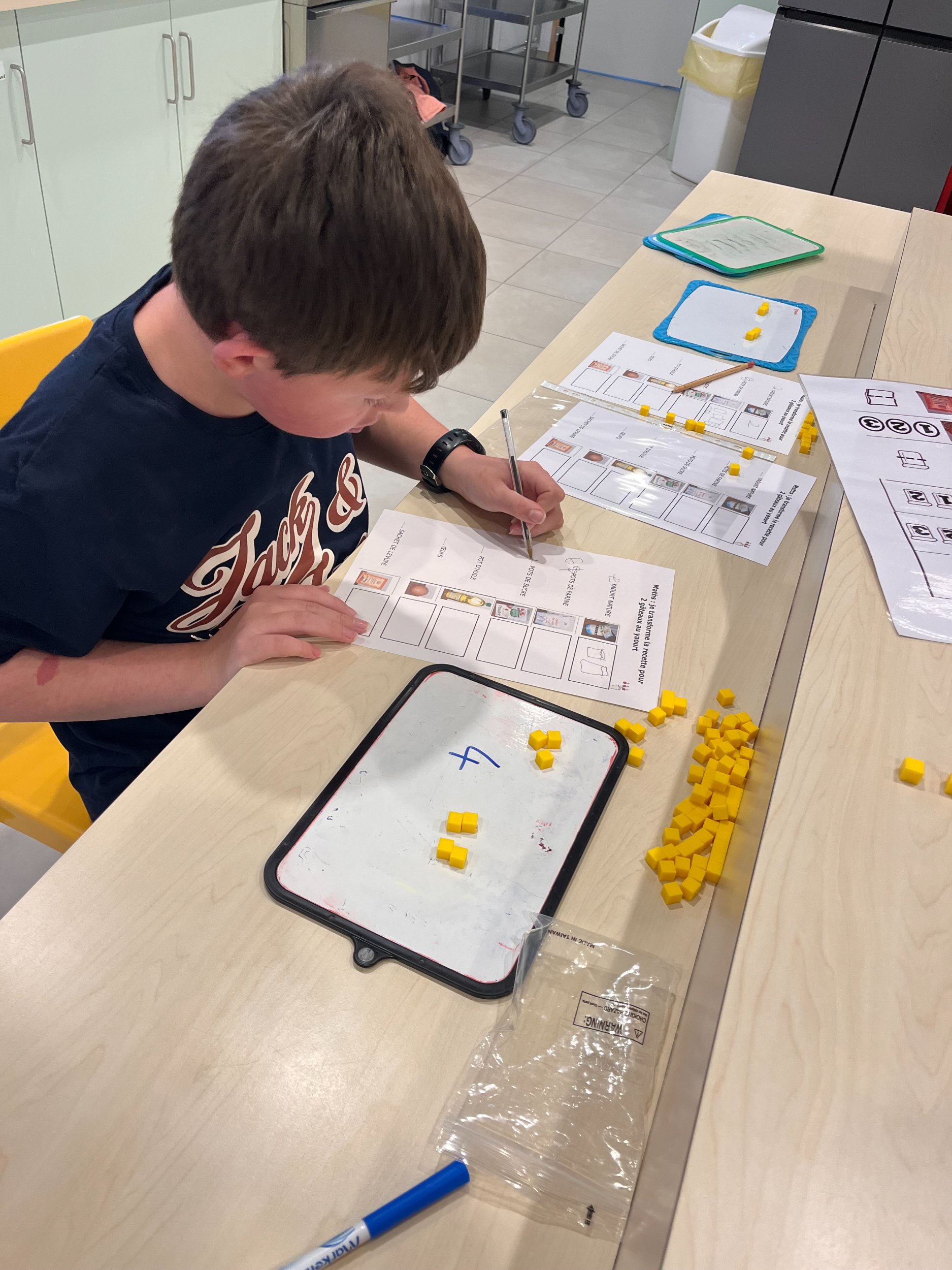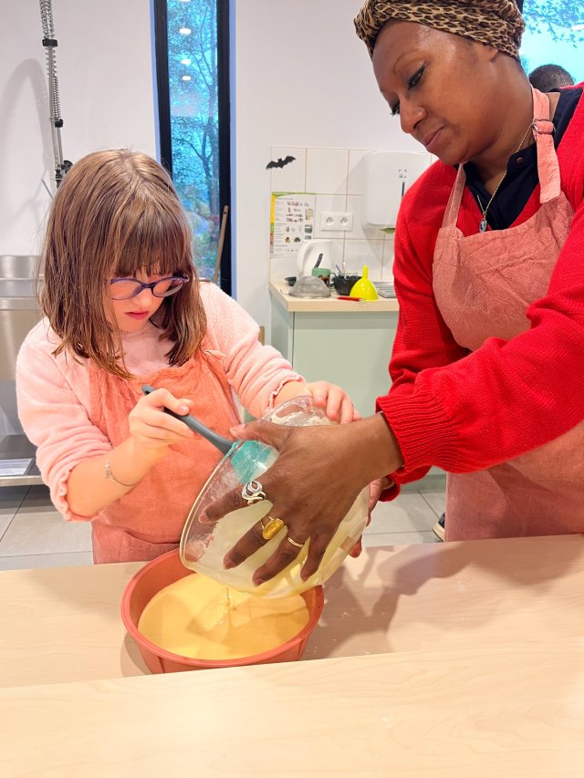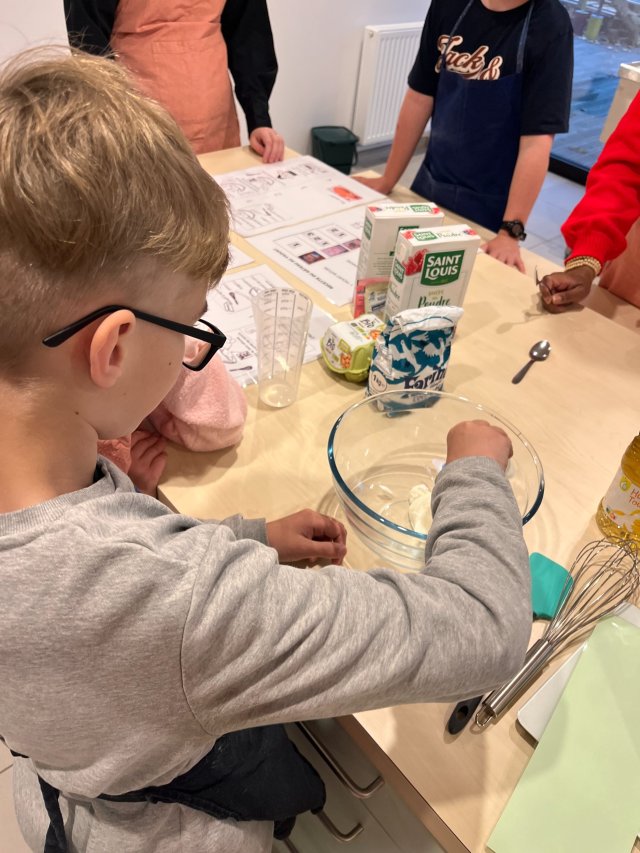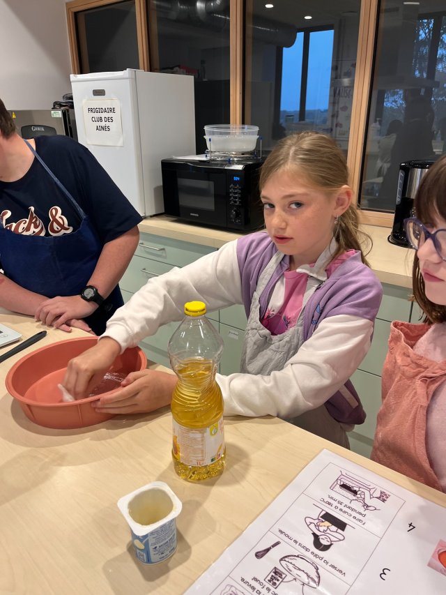 Lundi 13 octobre 2025, pour la dernière recette de la période, nous avons choisi de faire un bon gâteau au yaourt. Nous sommes allés dans la cuisine de la Mosaïque. Nous y avons désormais nos marques !