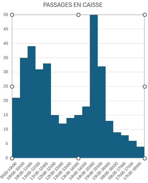 A la fin de la journée, on a calculé le total de l’argent dans la caisse. De retour en classe, nous avons fabriqué des graphiques pour montrer les heures où il y a eu le plus de monde et comment les gens ont payé.