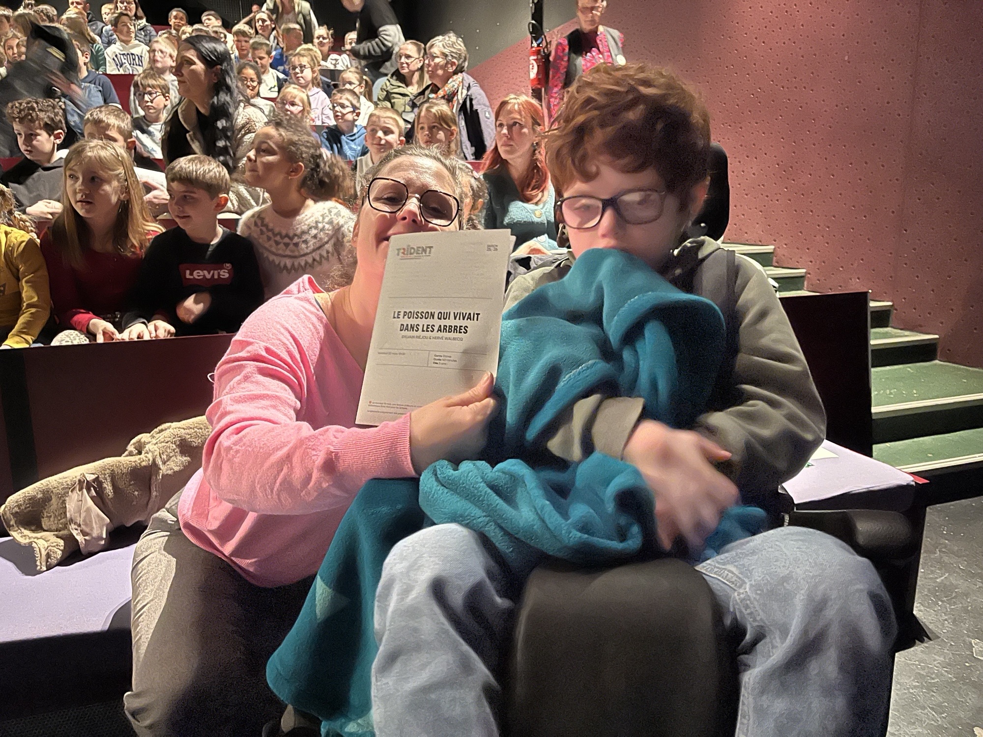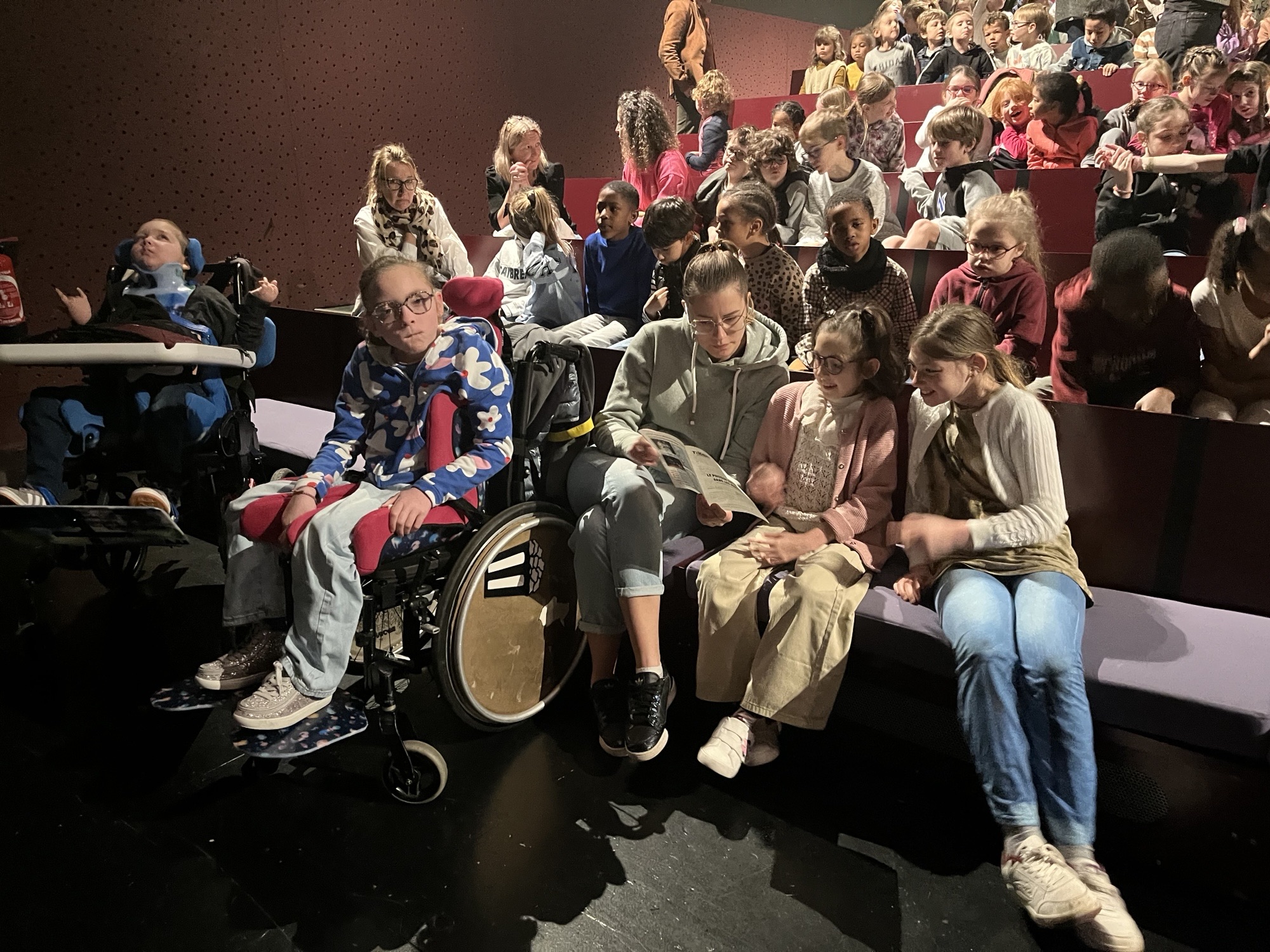 Ce vendredi 20 mars, les élèves de l’UEE de Bellevue et 4 jeunes de la Maison de Lily sont allés voir une pièce de théâtre au Vox. Le spectacle s’appelait Le poisson qui vivait dans les arbres. Les jeunes ont été attentifs pendant les 40 minutes du spectacle ! Les jeux de lumière et la musique les ont captivés.