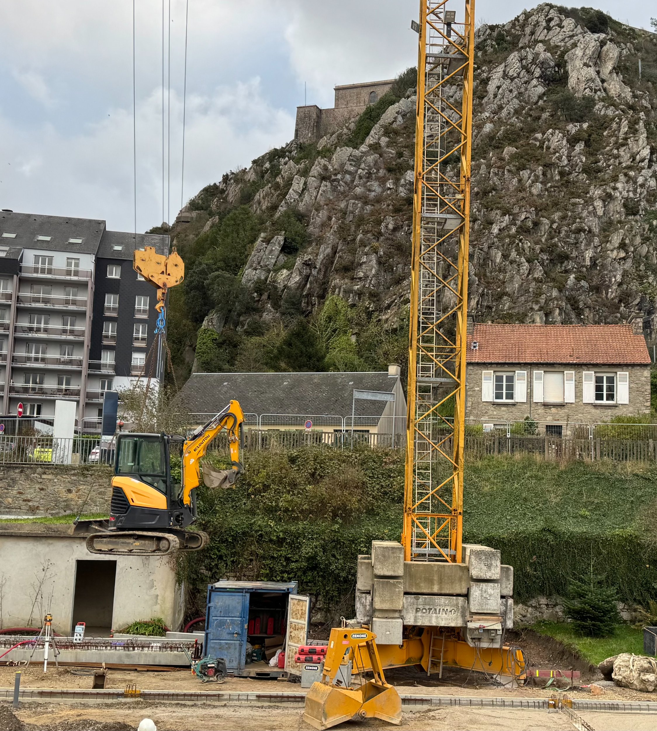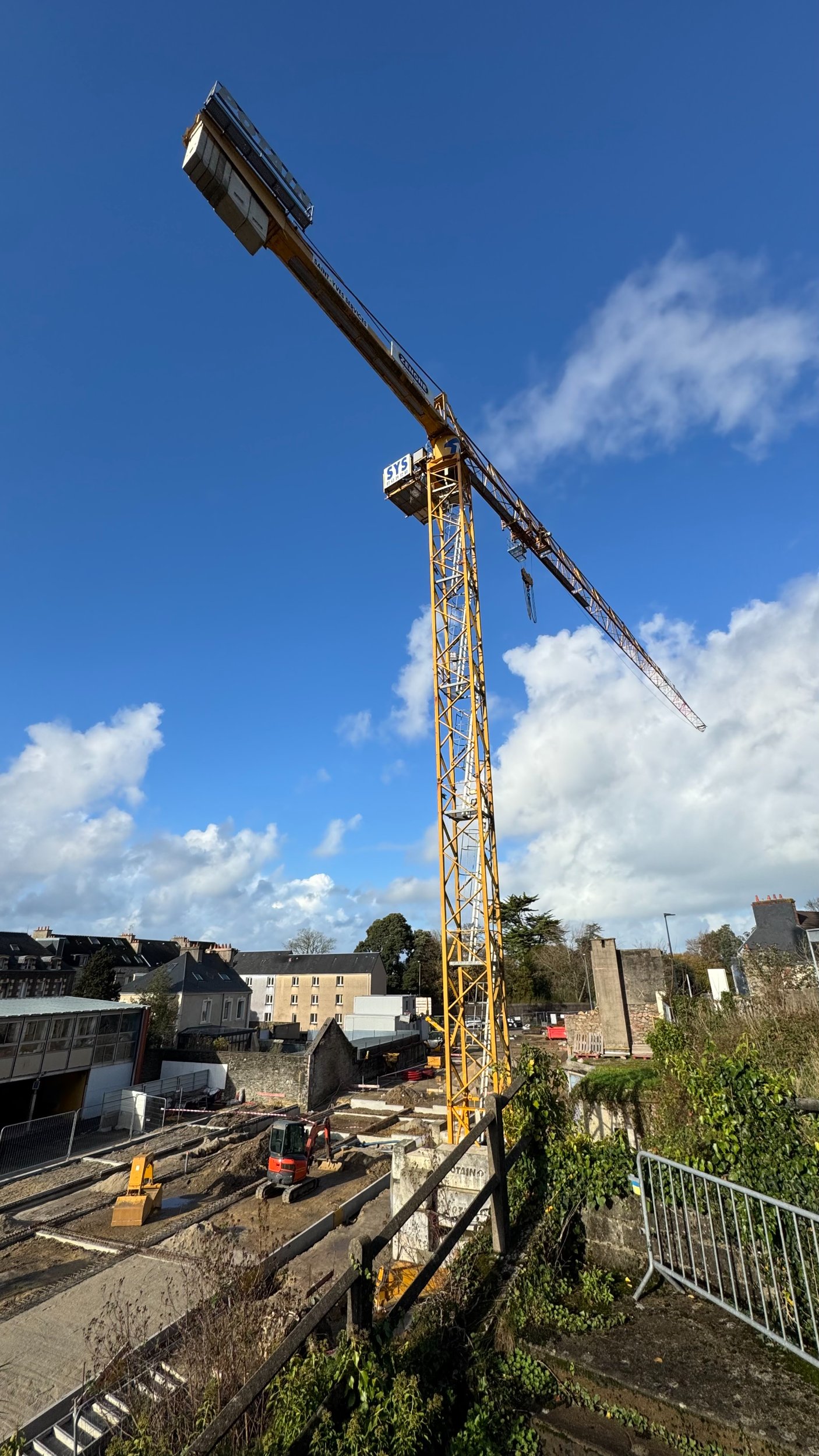 Une grue est arrivée. Elle transporte le matériel et les machines sur tout le chantier.