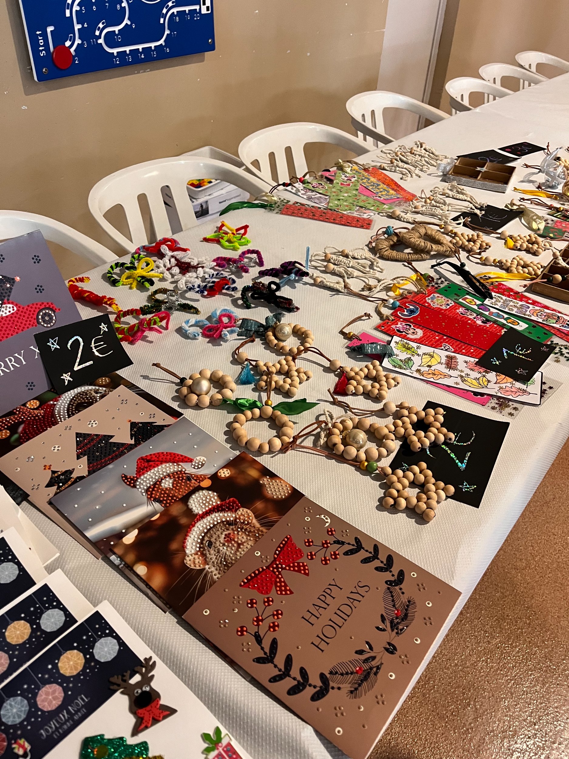 Nous avons vendu des choses à suspendre dans les sapins (étoiles, boules, ...), des marques pages, des portes clefs en macramé et des cartes de vœux.